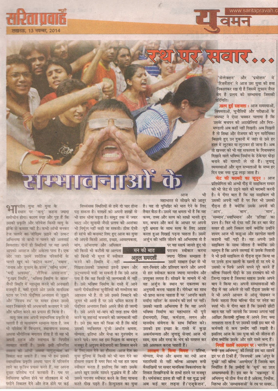 आज समस्याओं, विषमताओं, चुनौतियों और परीक्षाओं के जमघट ने ऐसा चक्कर चलाया है कि उसके बचपन की अठखेलियां और मित्र मंडली अब कहीं नहीं दिखती. अब दिखती है तो शिक्षा और रोजगार की मृग मारीचिका बिछाए हुए उन दुकानों में जहां से उसे हर हाल में लुटकर या लुटाकर ही जाना है. अब तो खच्चर को भी यह सफलता के दिवास्वप्न दिखाने वाले भविष्य निर्माण के ठेकेदार घोड़ा बनाने की गारंटी ले रहे हैं. जुगाडू व्यवस्थाओं और मूल सभ्यताओं के मध्य हर दिन एक नया युद्ध लड़ा जाता है. आज प्रतियोगिता की अंधी दौड़ में साइकिल सवार को भी जेट से उड़ने वाले की बराबरी करनी है. ये दीगर बात है कि यह साइकिल भी उसकी अपनी नहीं है पर फिर भी उसको दौड़ना ही है क्योंकि उसके अपनों की ‘आन’, ‘बान’, ‘मान’, ‘सम्मान’, ‘स्वाभिमान’ और ‘प्रतिष्ठा’ का प्रश्न है. फिर भी ऐसा नहीं कि हर बार जेट सवार ही आगे निकल जायें क्योंकि उन्होंने शायद आज भी कछुआ और खरगोश वाली कहानी नहीं पढ़ी है. वह अपनी उसी साइकिल के साथ जीतता है क्योंकि उसे मालुम है कि अपने तरुणाई में उसके पिताजी ने भी इसी साइकिल से दौड़ना शुरू किया था पर उनके हाथ खाली के खाली ही रह गए थे उसको न सिर्फ अपने सपने पूरे करने हैं बल्कि पिछली पीढ़ी के उस हस्तक्षेप को भी ज़िंदा रखना है जिसका साहस उसके अपने बाप ने किया था. अपनी संभावनाओं की दौड़ में वह अकेले तो नहीं दौड़ता उसके मां ने भी अपने आचल से आसूं पोछकर न सिर्फ सहारा दिया बल्कि पीठ पर स्नेह का स्पर्श भी. ये दीगर बात है कि उसकी छोटी बहन यह नहीं जानती कि उसका अपना भाई आखिर किताबी दुनिया में अपने लिए क्या तलाशता रहता है पर उसकी राखी इस बार भी कर्मवती से कम उम्मीद नहीं रखती है. इसलिए आज के उस युवा को भी जीतना ही होगा क्योंकि उसके और सारे रास्ते बंद हैं. इस अभिमन्यु की निगाहें इस बार सातवें द्वार पर ही टिकीं हैं ‘विजयश्री’ अब ‘अंगूर के गुच्छे’ नहीं बल्कि ‘अरुणोदय’ है जिसके बाद निर्धारित है कि उम्मीदों के ‘सूर्य’ का उदय अवशम्भावी है. इस बार के ‘चक्रव्यूह’ में अभिमन्यु भी ठीक वैसा ही है अकेला, निर्भीक, निहत्था और ‘संभावनाओं’ के रथ पर सवार..............